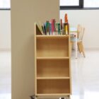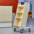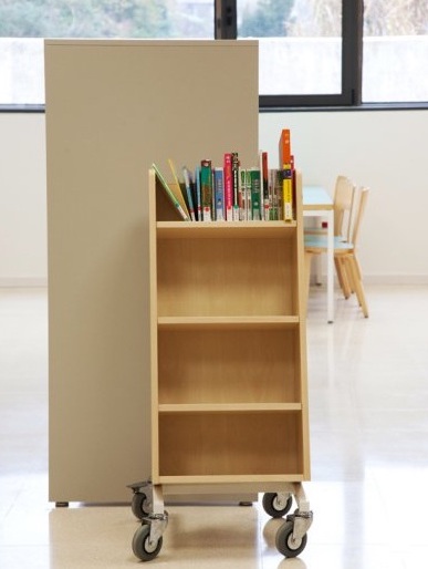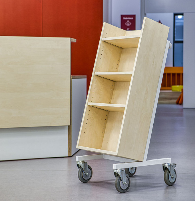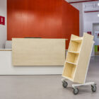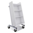 Carro portalibros de madera, a una y a dos caras, con ruedas y estantes de madera inclinados para el mejor transporte de libros.