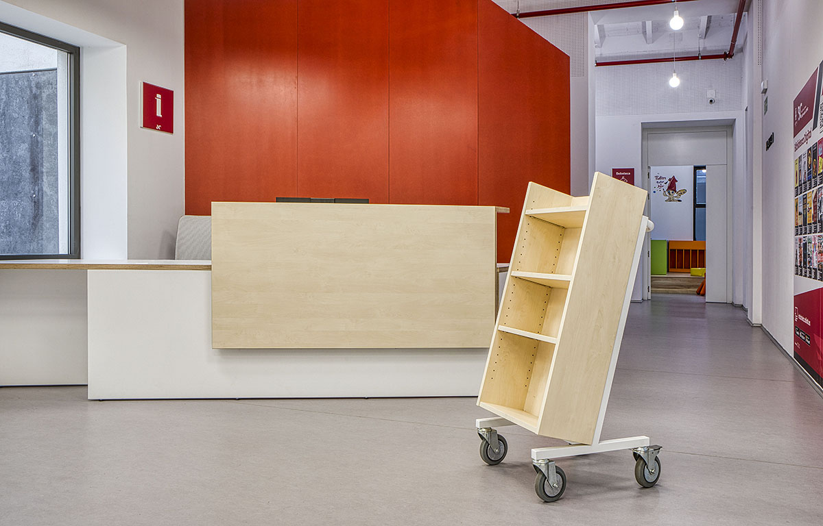 • Estructura metálica en tubo de 40×25 mm pintada con polvo epoxy-poliester polimerizada al horno a 200 º. Con 4 ruedas especiales, de gran resistencia al peso y bandas de goma para que sean silenciosas.Mueble fabricado en tablero rechapado en haya de 19 mm con todos los frentes macizados con madera de haya (15 mm de listón) y moldurados. Barnizado en su color natural con fondo y laca poliuretánicos. Con 4 niveles de estantes vistos a dos caras y con una leve inclinación interior para, por gravedad, retener los libros.