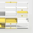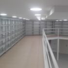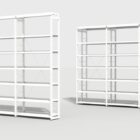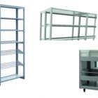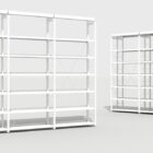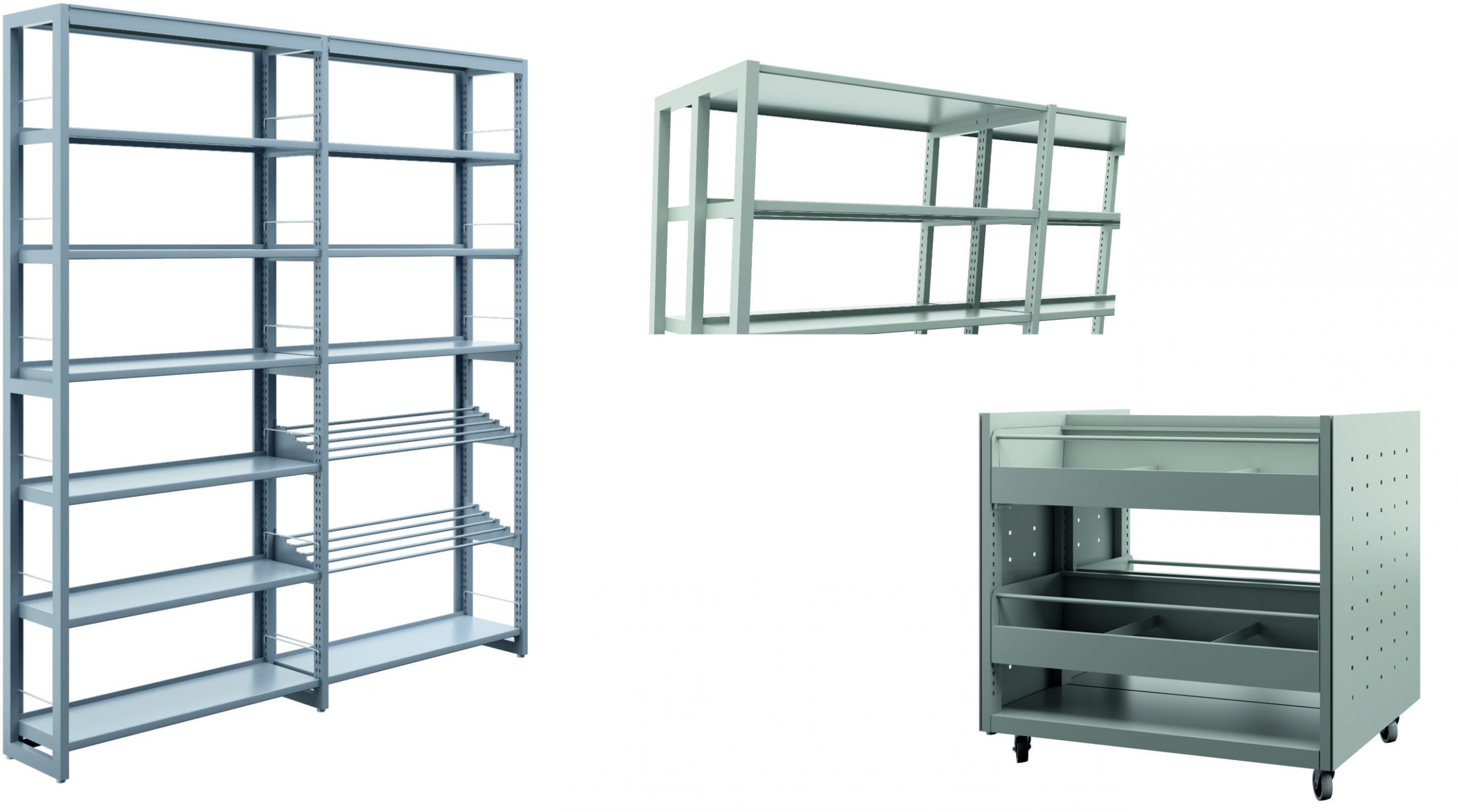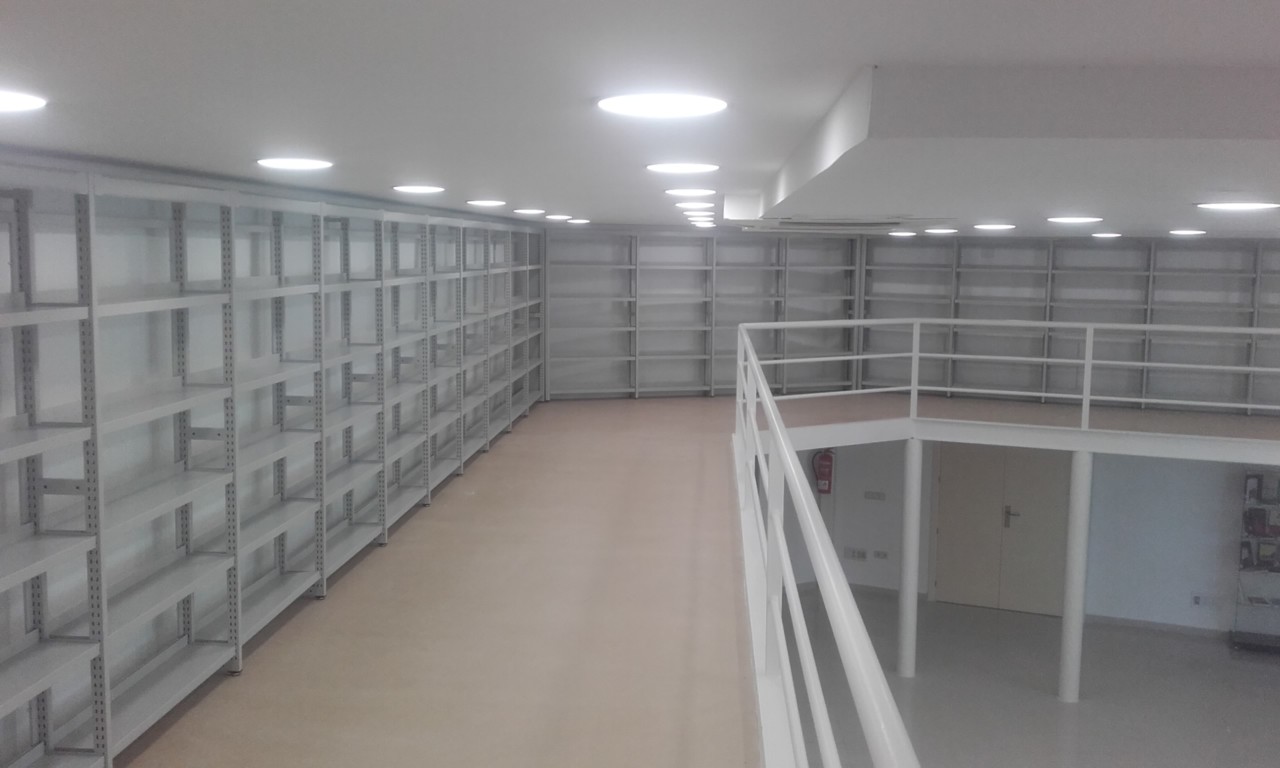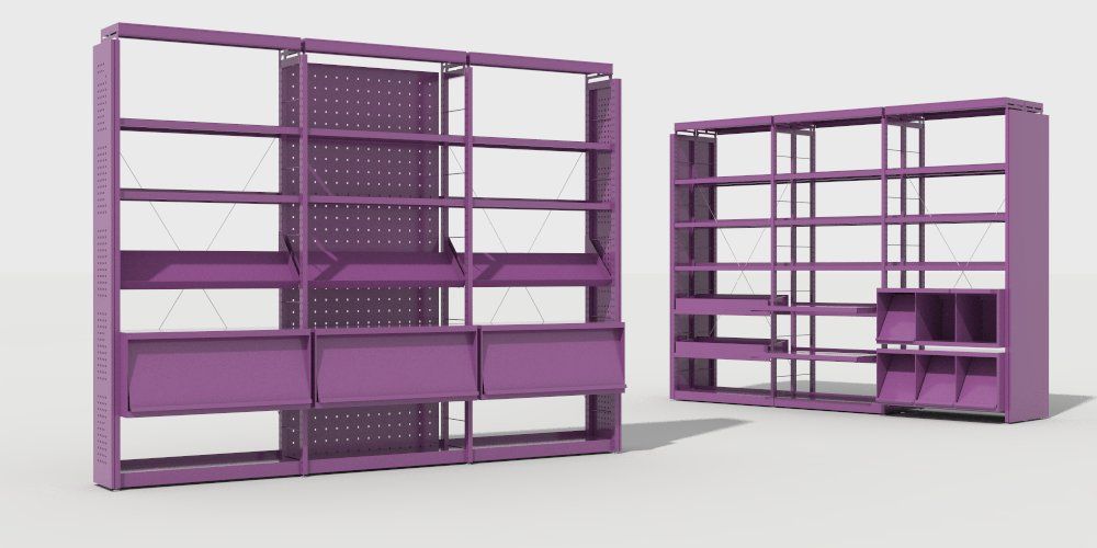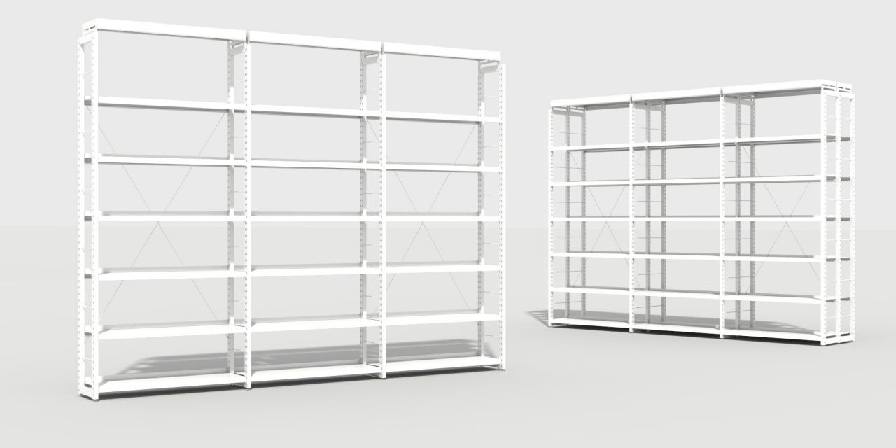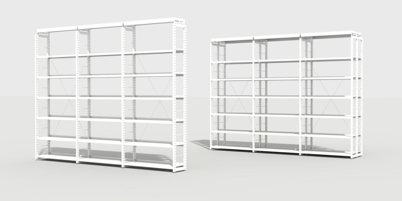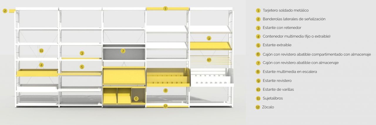 Estantería metálica, a una o dos caras. Costados fabricados con doble tubo vertical de acero formando una escalerilla, arriostrados con bastidor. Tapa con perfil señalizador de 5 cm. Estantes graduables en altura fijados mediante cartelas laterales a los costados, con 3 pliegues longitudinales en lados largos, posibilidad de retenedor trasero y tarjetero.