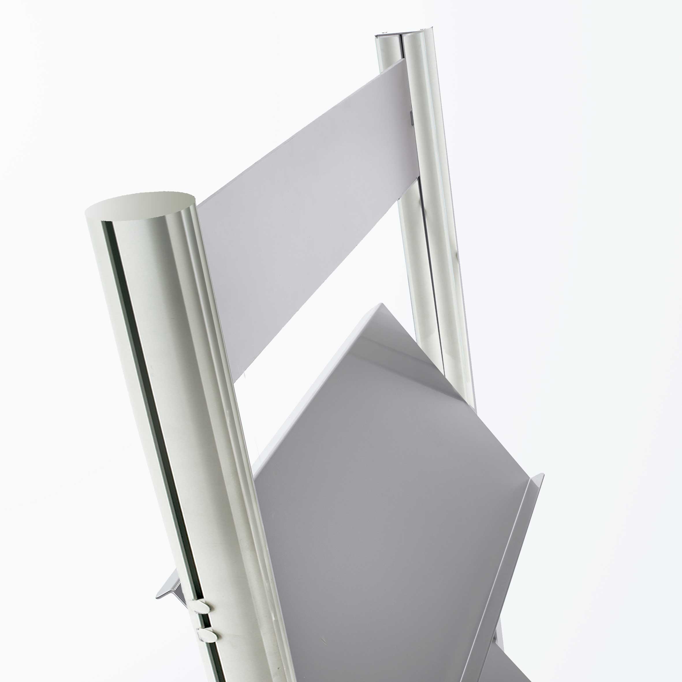 Expositores compuestos por 2 soportes elípticos verticales de aluminio en plata mate, con estantes metálicos pintados en color gris. Ideal para catálogos y revistas en formato DIN A4.