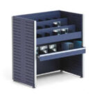 - Estantes: Fabricados en chapa blanca tipo AP-02 de e=1 mm y 3 pliegues longitudinales por lado. Incluyen cartelas laterales de separación.