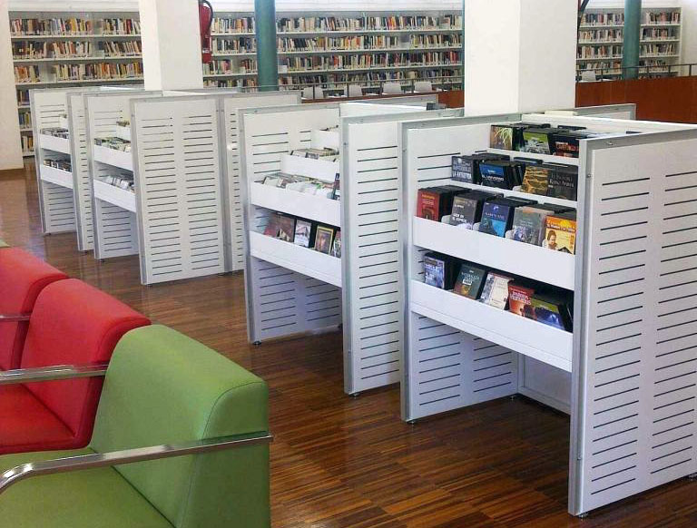 Expositor para novedades metálico, a una cara, con 9 niveles de exposición y frente en escalera con terminación de metacrilato para una mejor visualización. Con goma estriada en el interior para evitar deslizamiento de los artículos expuestos. Posibilidad de ruedas ocultas.