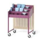 Expositor multimedia infantil con ruedas. Fácil de mover, con trasera en DM lacado final a elegir entre una amplia gama de colores que Metalundia pone a su disposición.