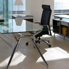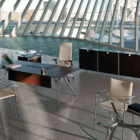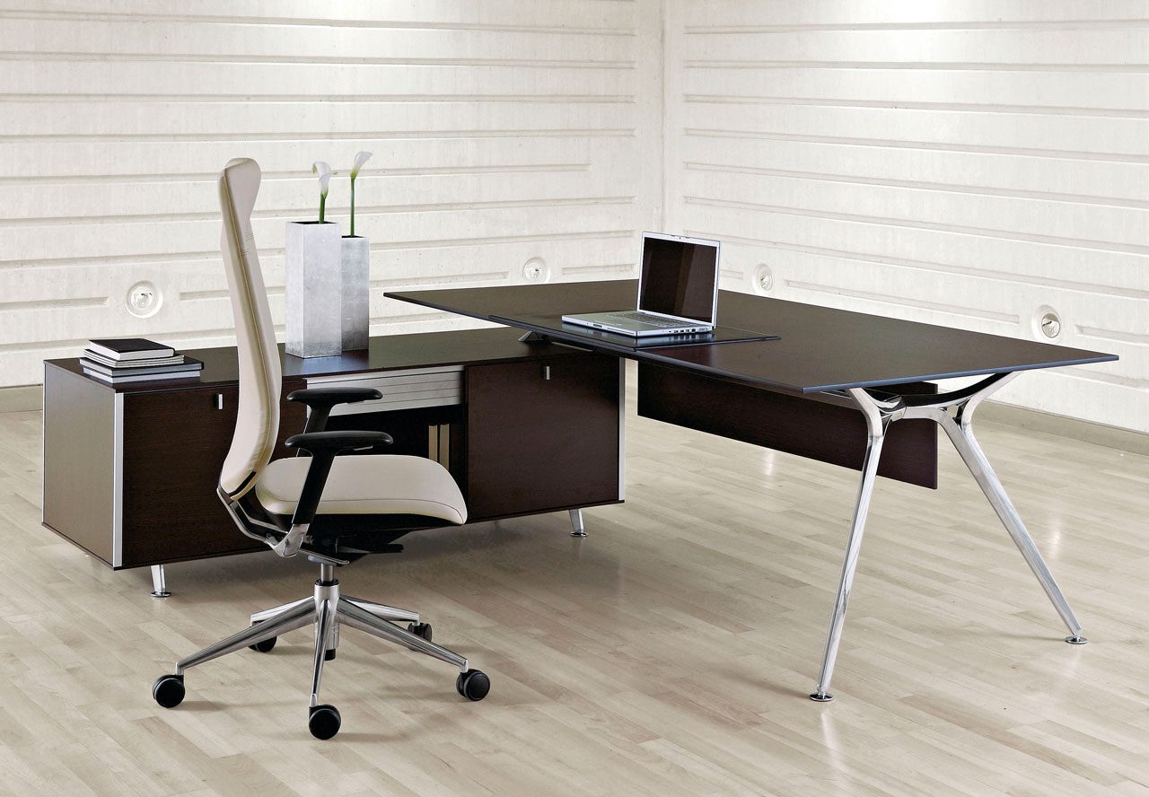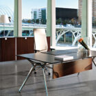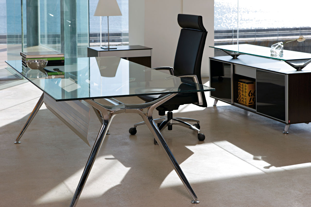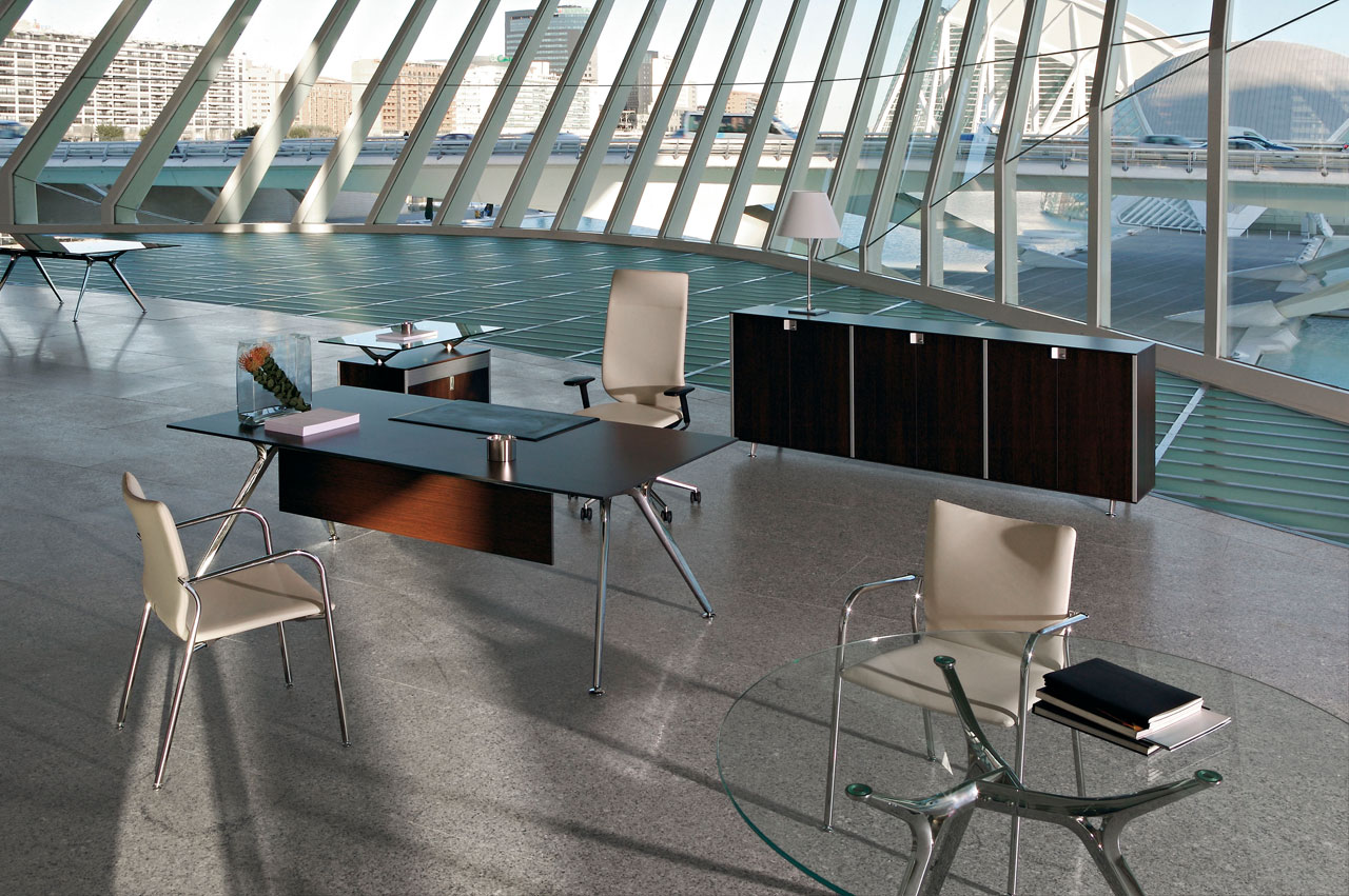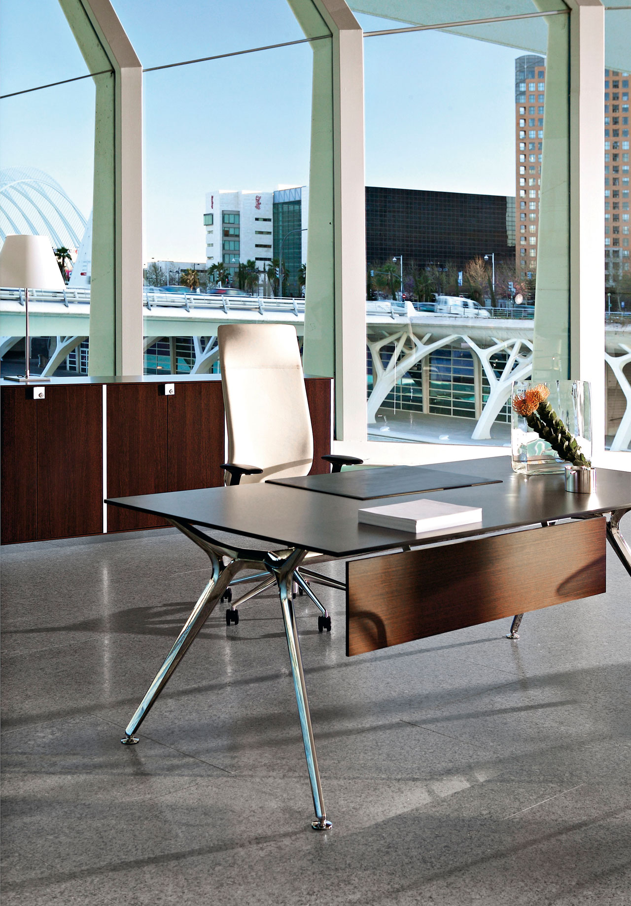 Arkitek muestra su lado más vanguardista y exclusivo en despachos personales y de dirección. Una estructura robusta que suspende en el aire un delgado plano de trabajo en fenólico o vidrio.