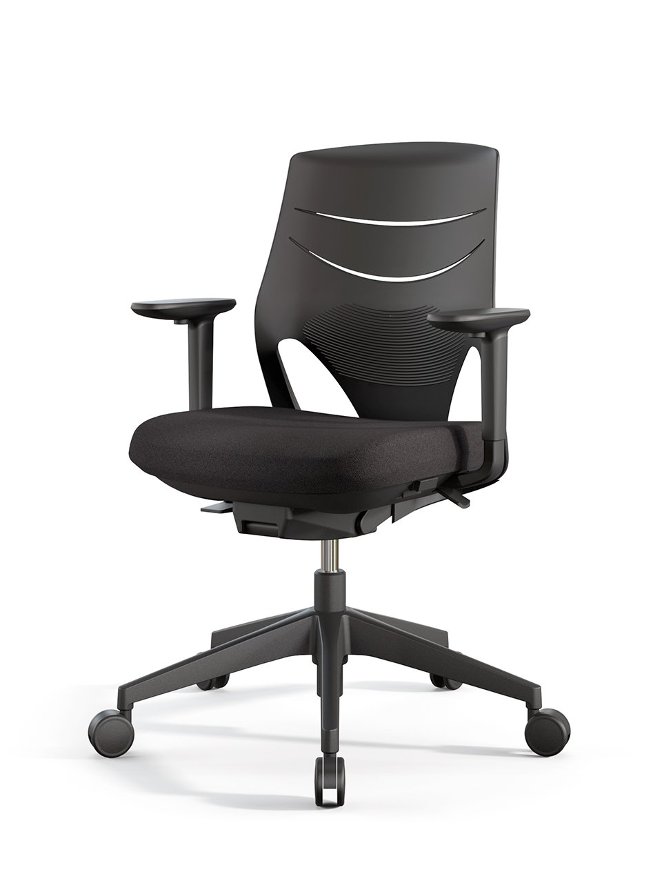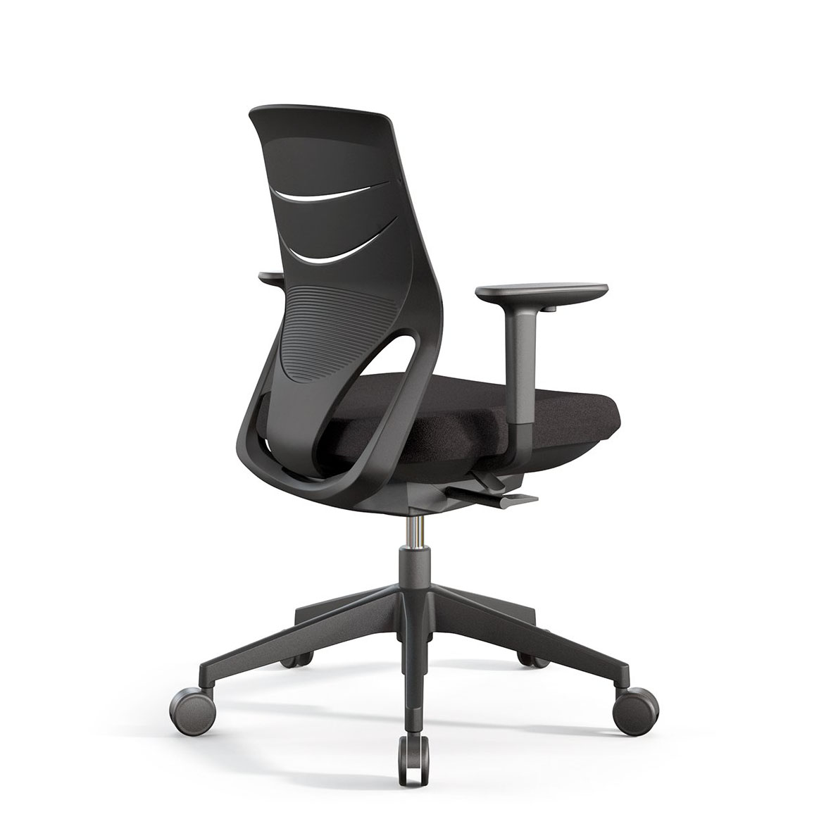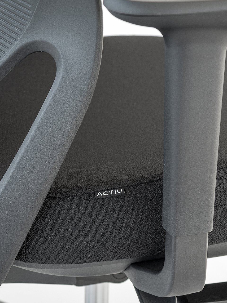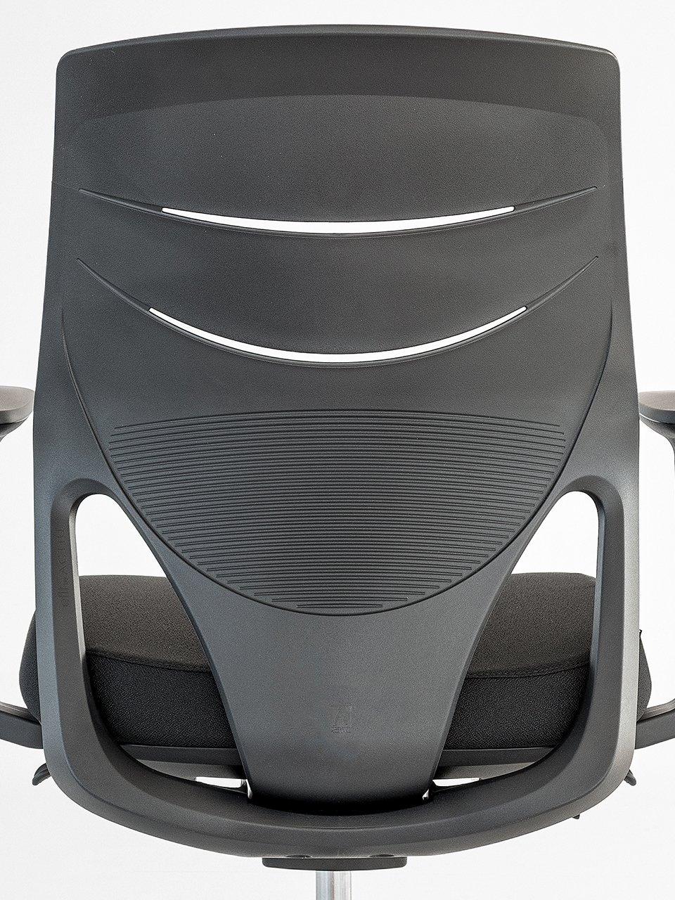 El innovador diseño del respaldo, fabricado en polipropileno y fibra de vidrio, permite una adaptabilidad al movimiento del usuario, complementado con el ajuste automático del refuerzo lumbar incorporado, que aporta un alto grado de confort.