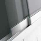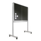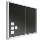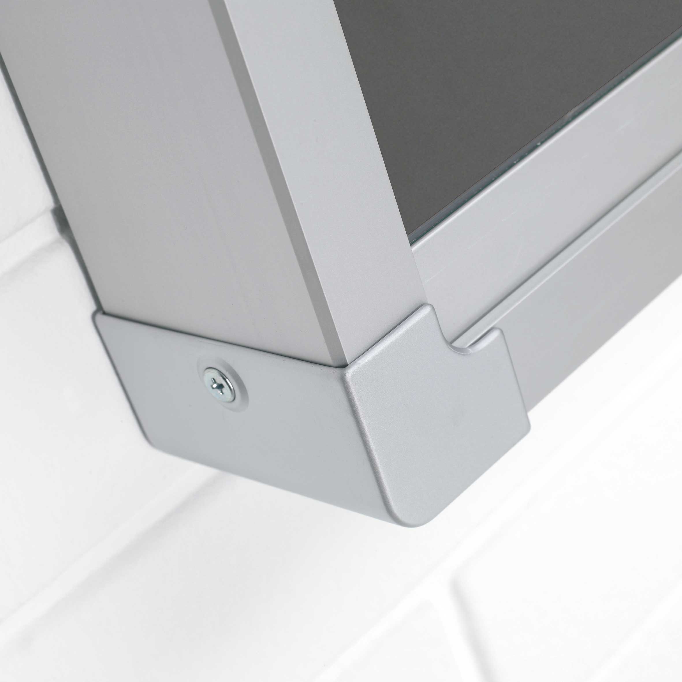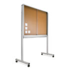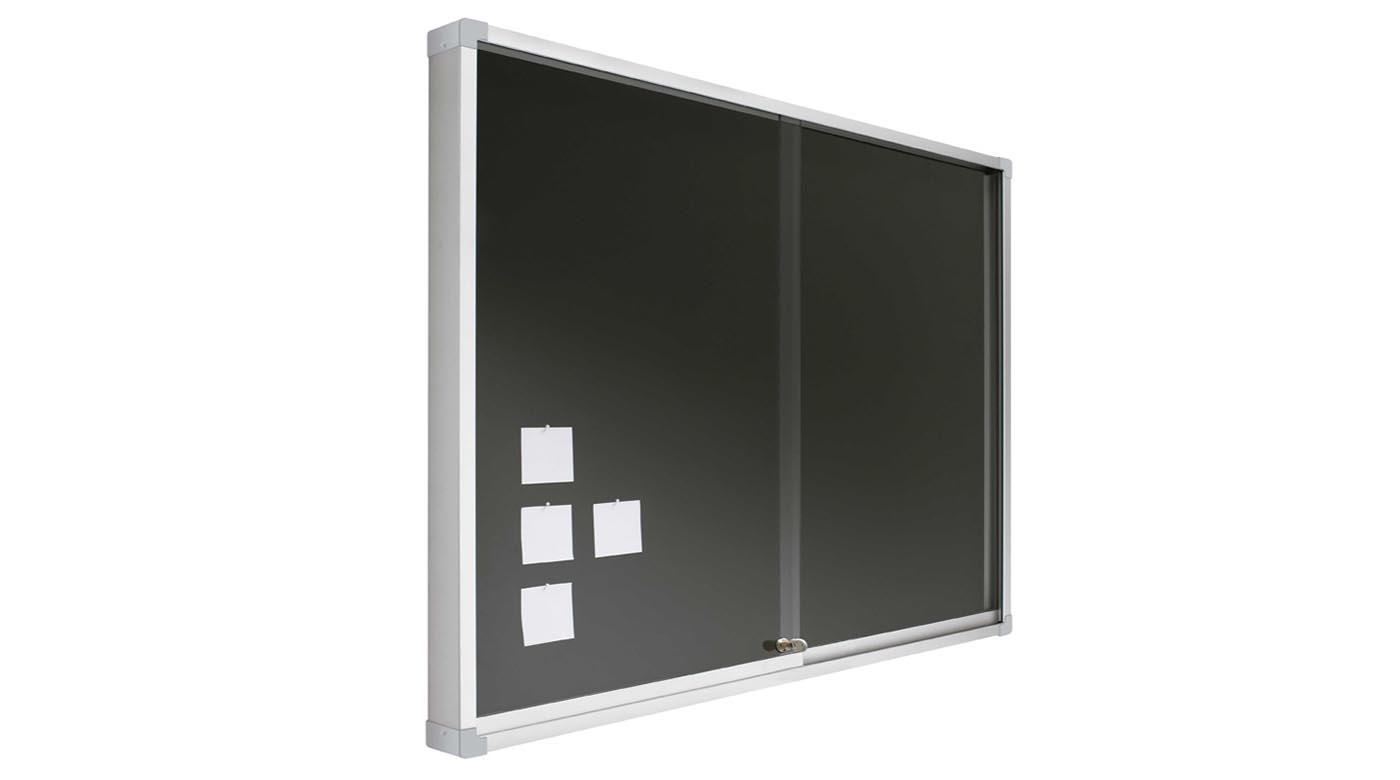 Vitrina de anuncios mural con fondo de corcho tapizado, marco de aluminio anodizado en color plata mate natural y cantoneras redondeadas de plástico gris, puertas correderas de metacrilato y cerradura con llave.